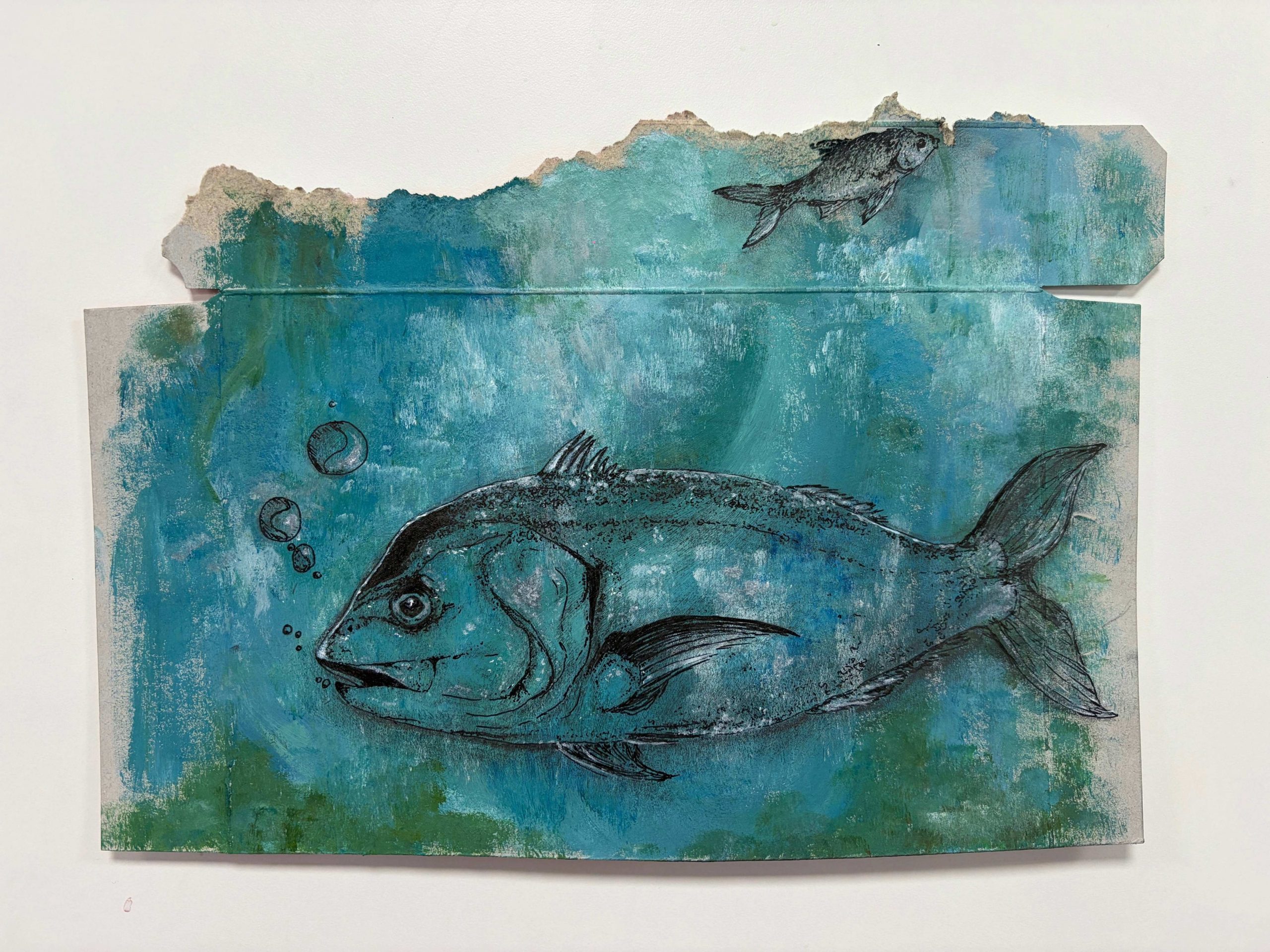 Mixed Media -Acrylic paint, pen and pencil on recycled packaging, 33cm x 45cm