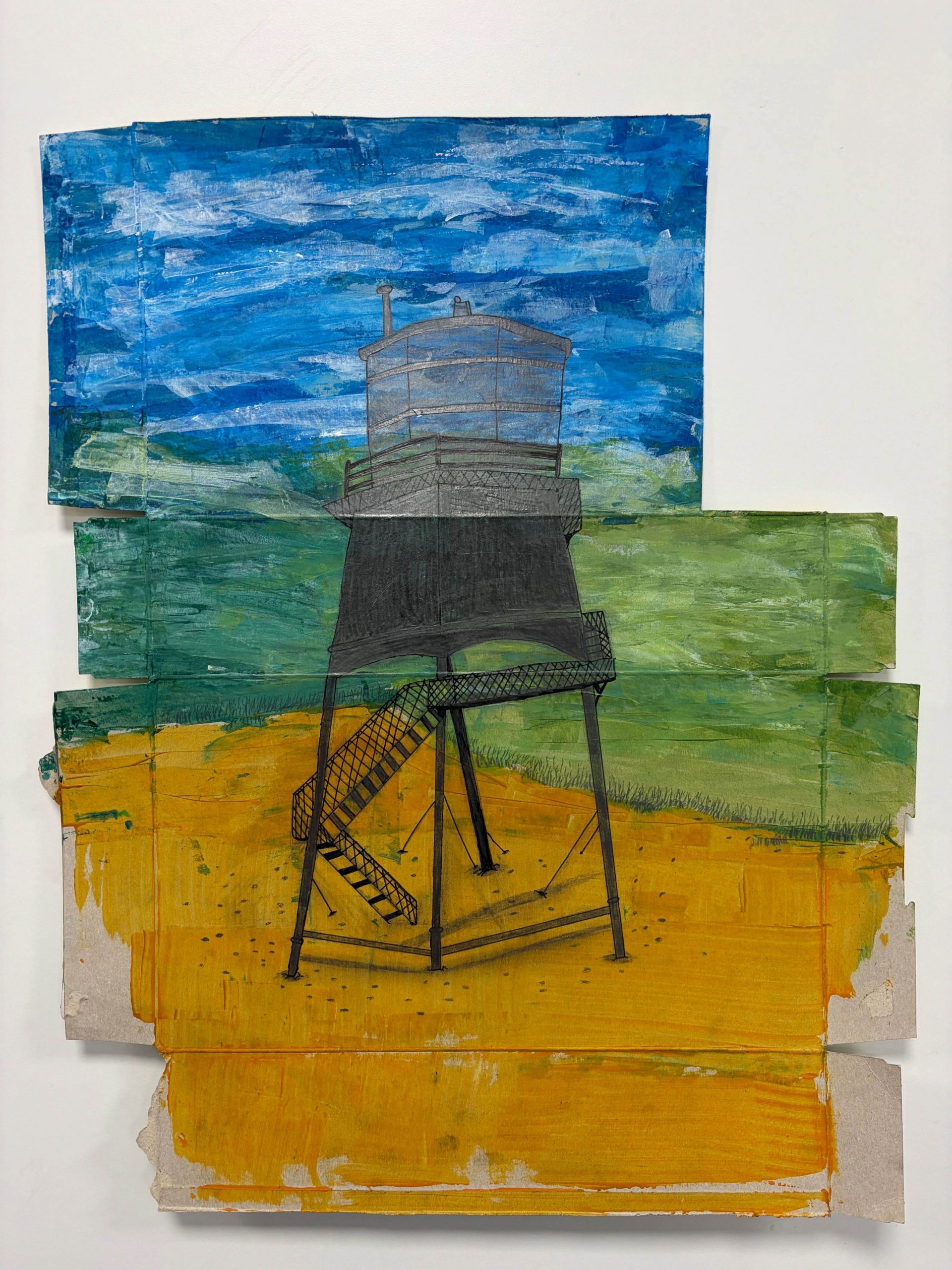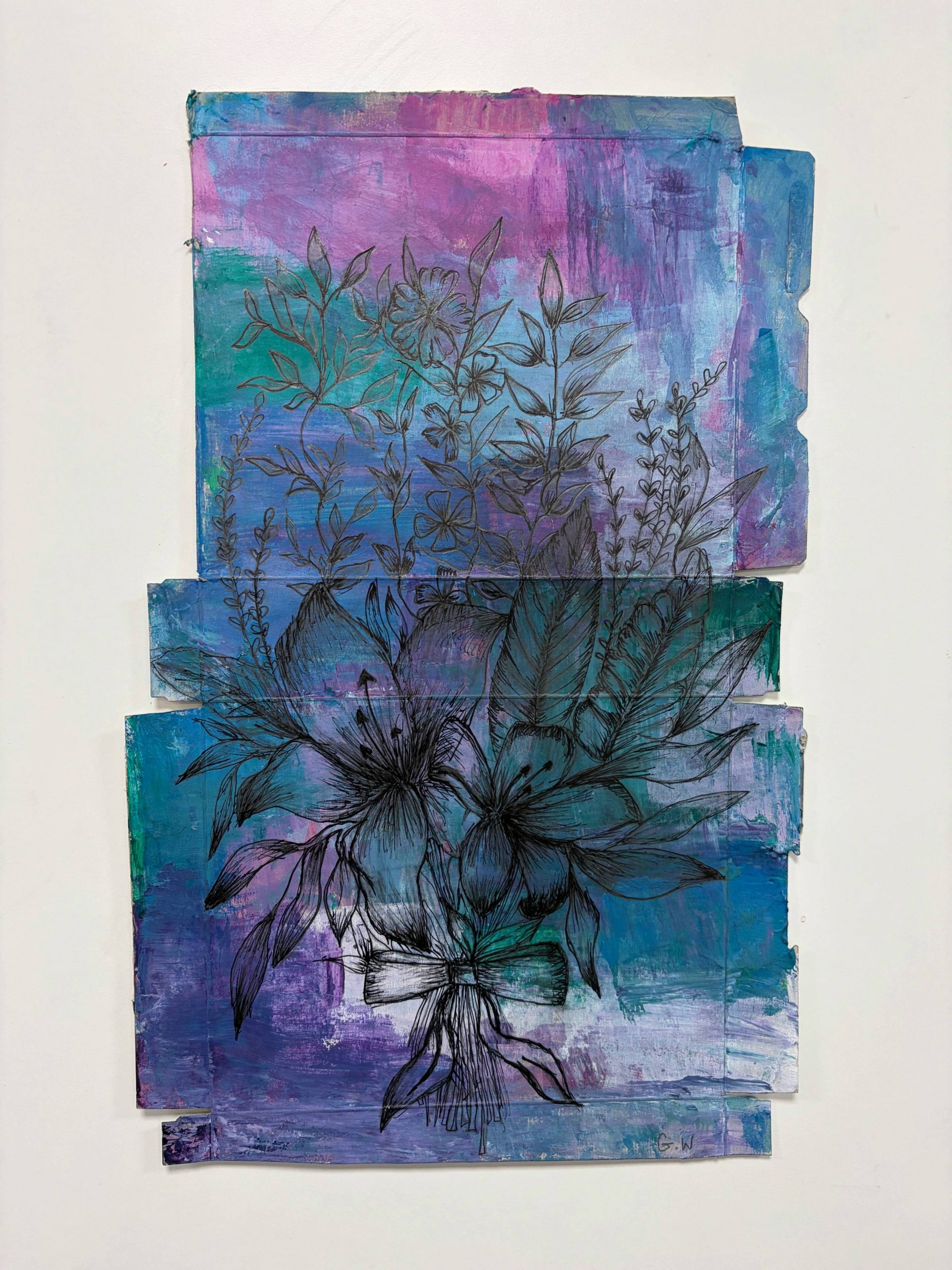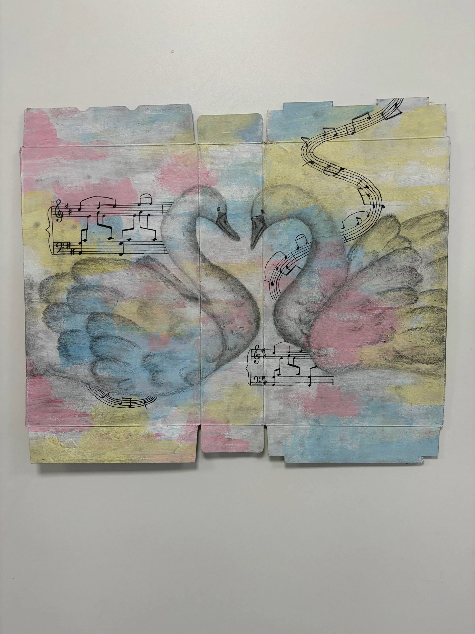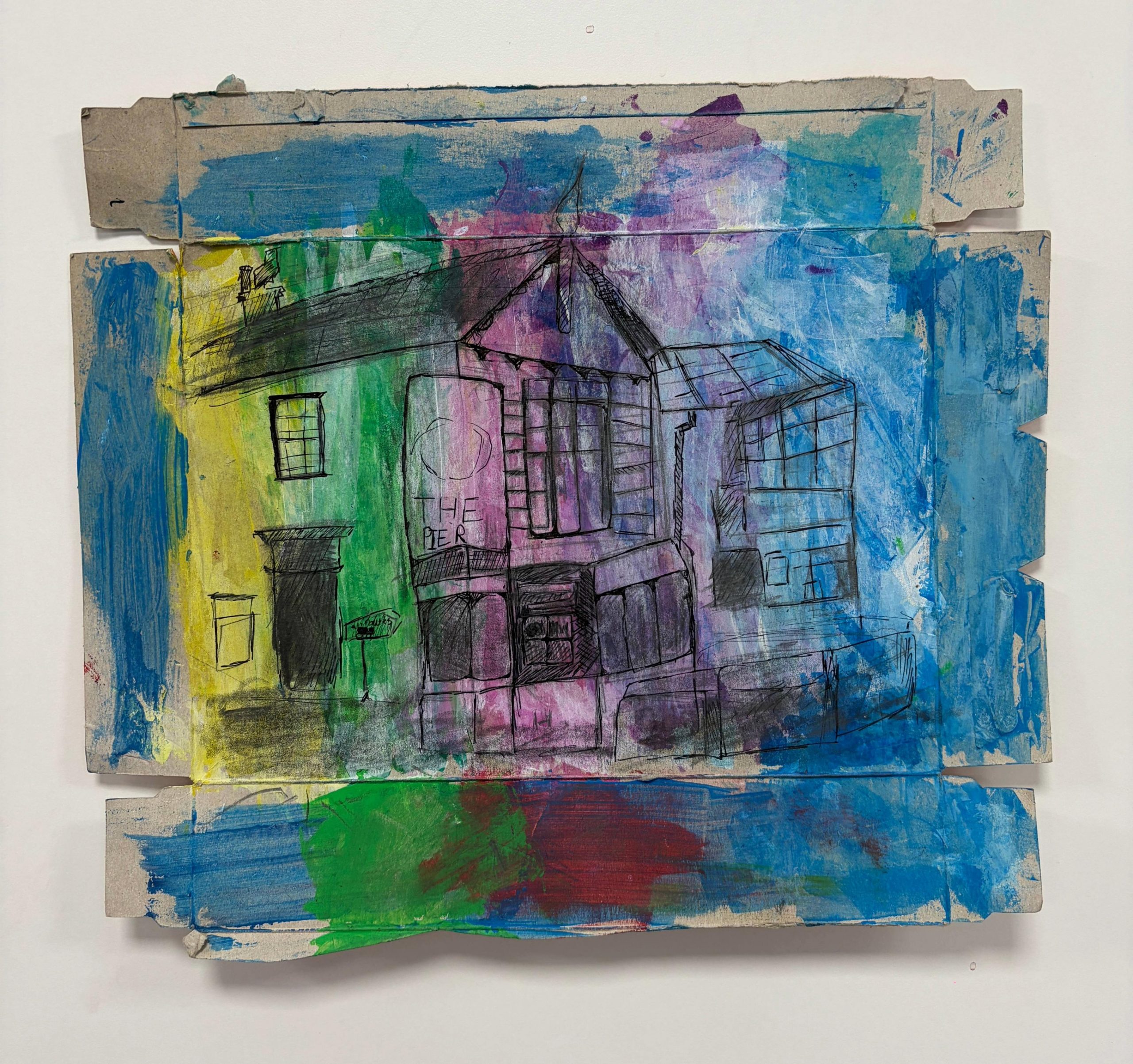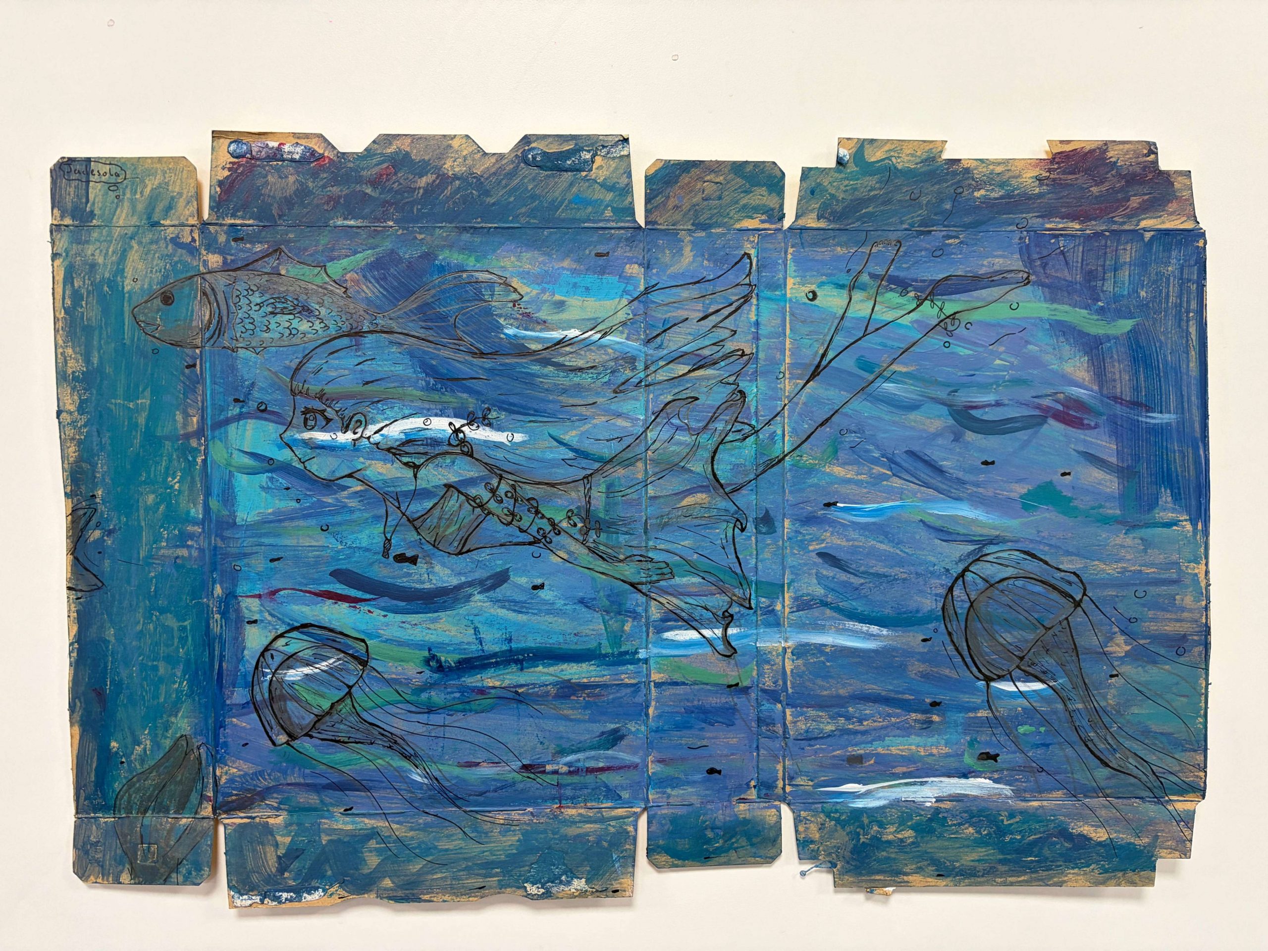 Mixed Media -Acrylic paint, pen and pencil on recycled packaging, 43cm x 55cm