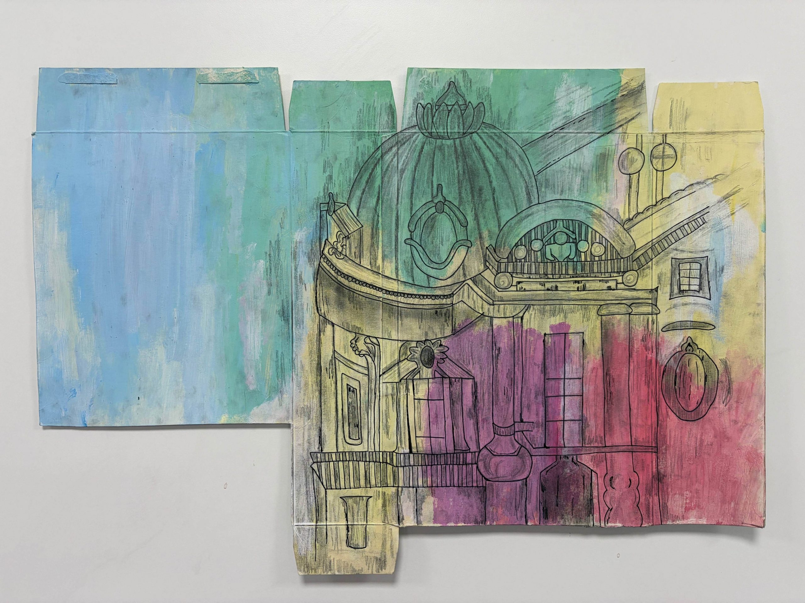 Mixed Media -Acrylic paint, pen and pencil on recycled packaging, 34cm x 54cm