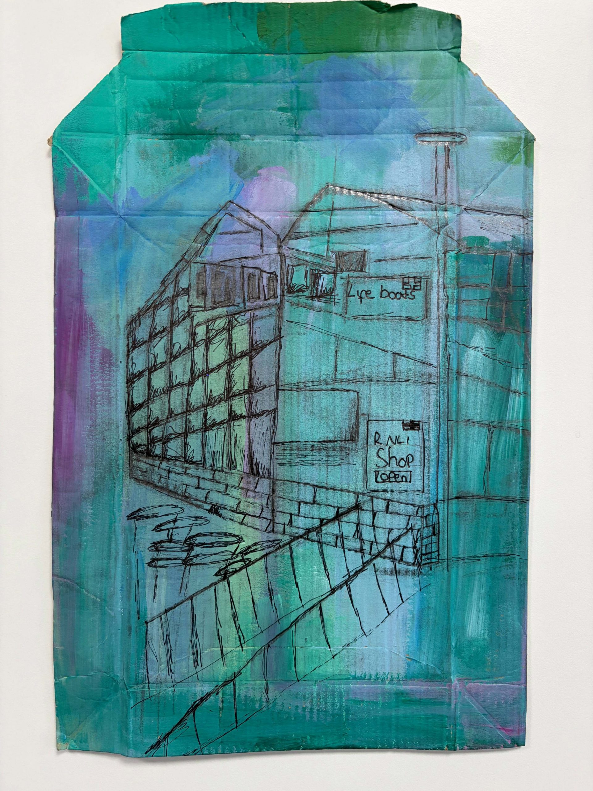 Mixed Media -Acrylic paint and pen on recycled packaging, 34cm x 21cm