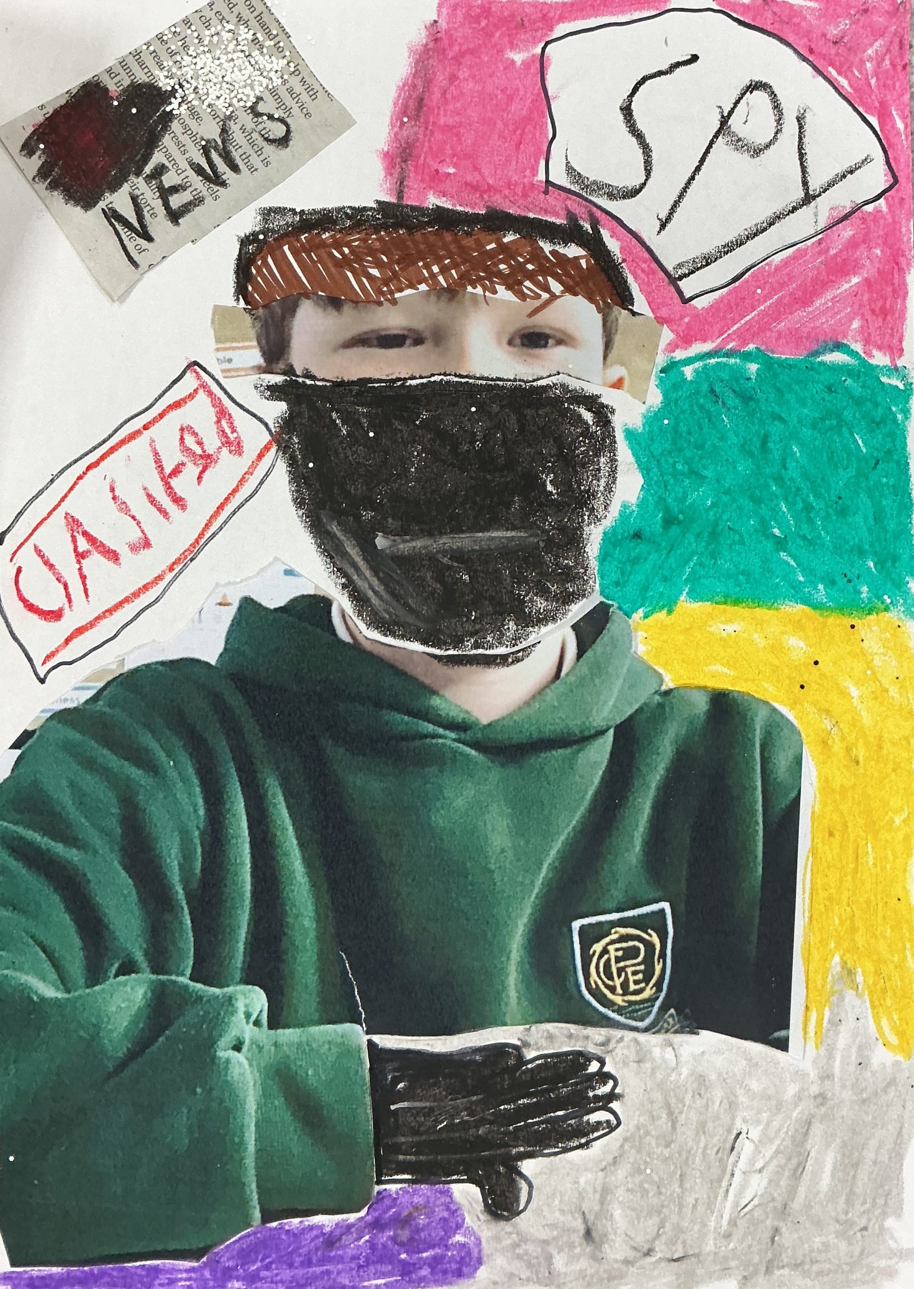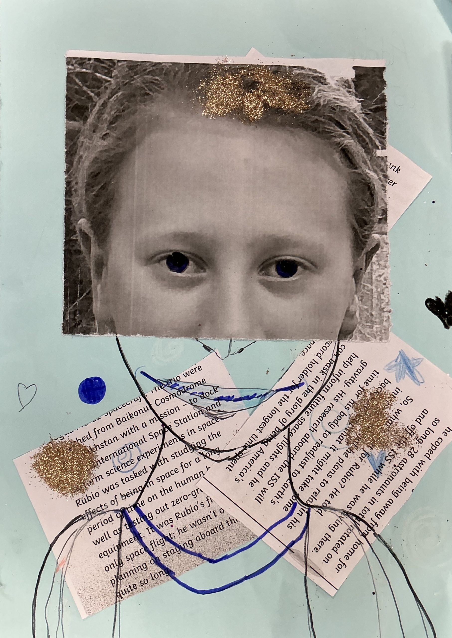 Photo, newspaper, oil pastel, glitter, 21cm x 29cm