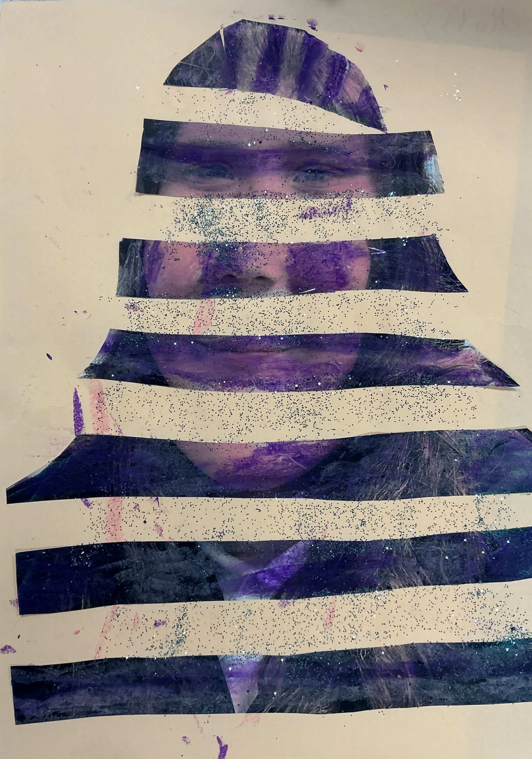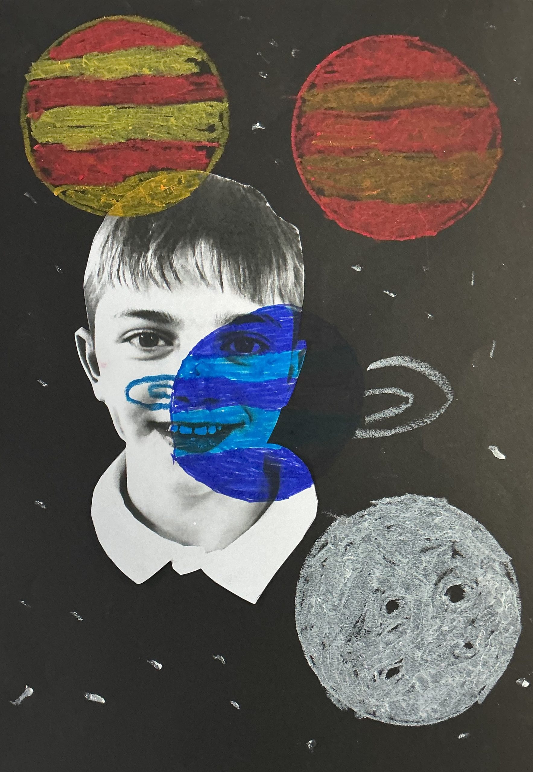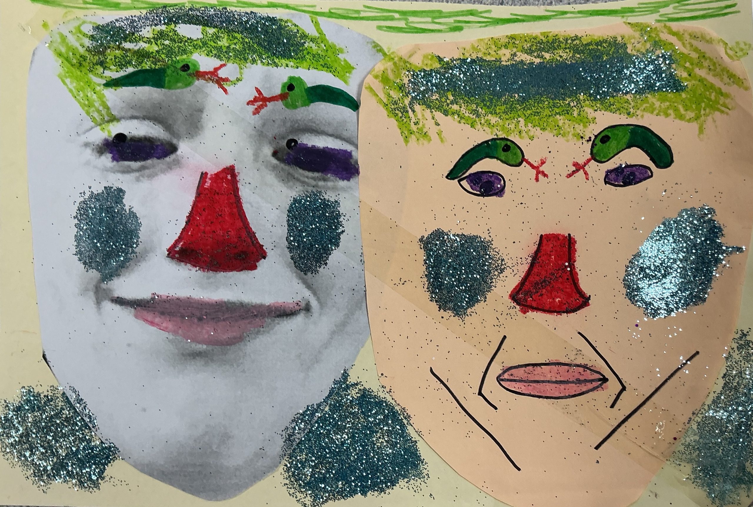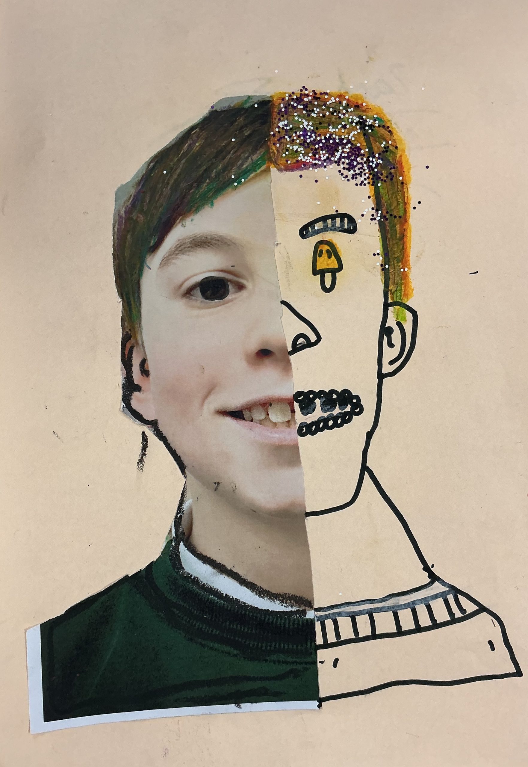 Photo, oil pastel, pen, glitter, 21cm x 29cm