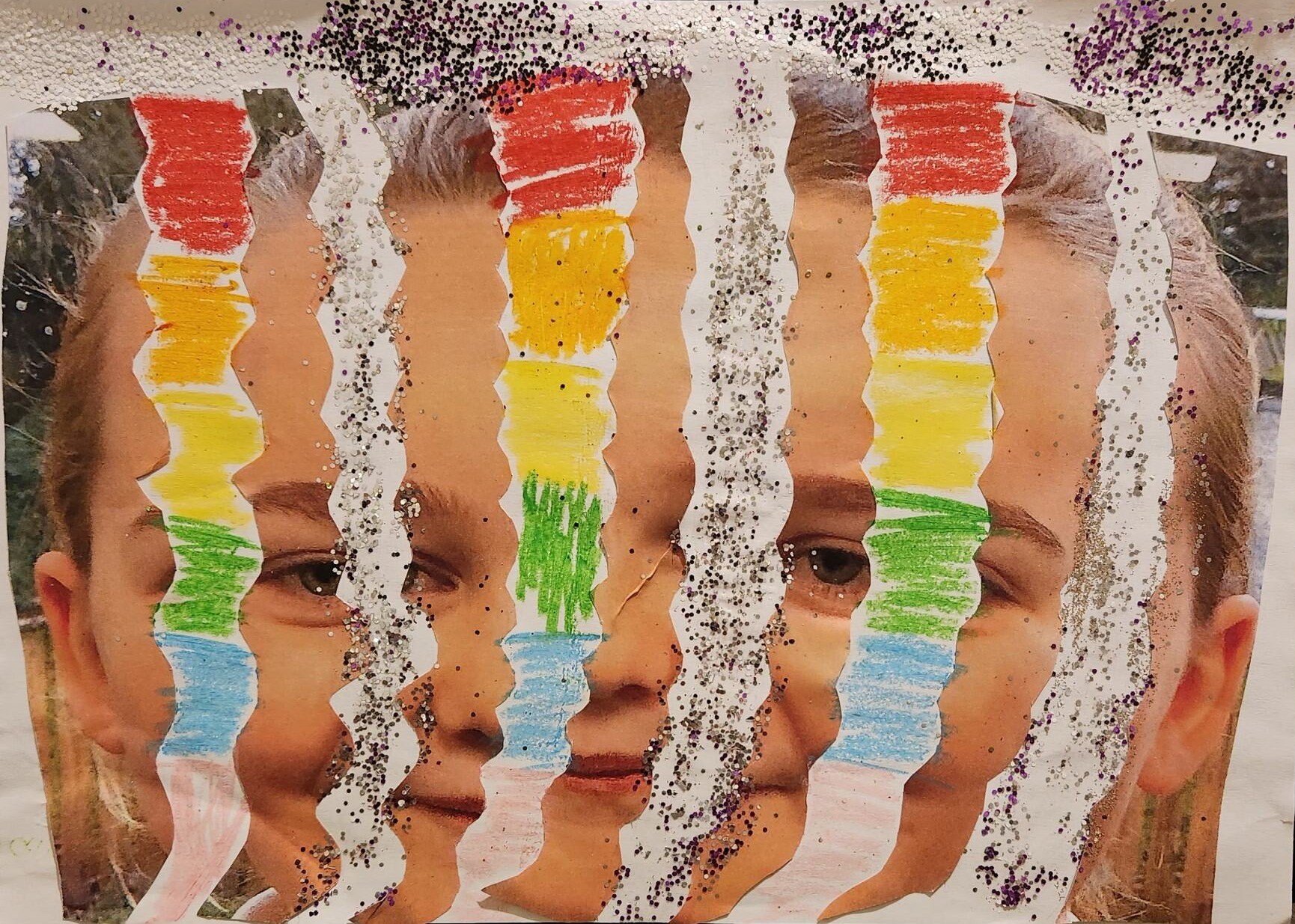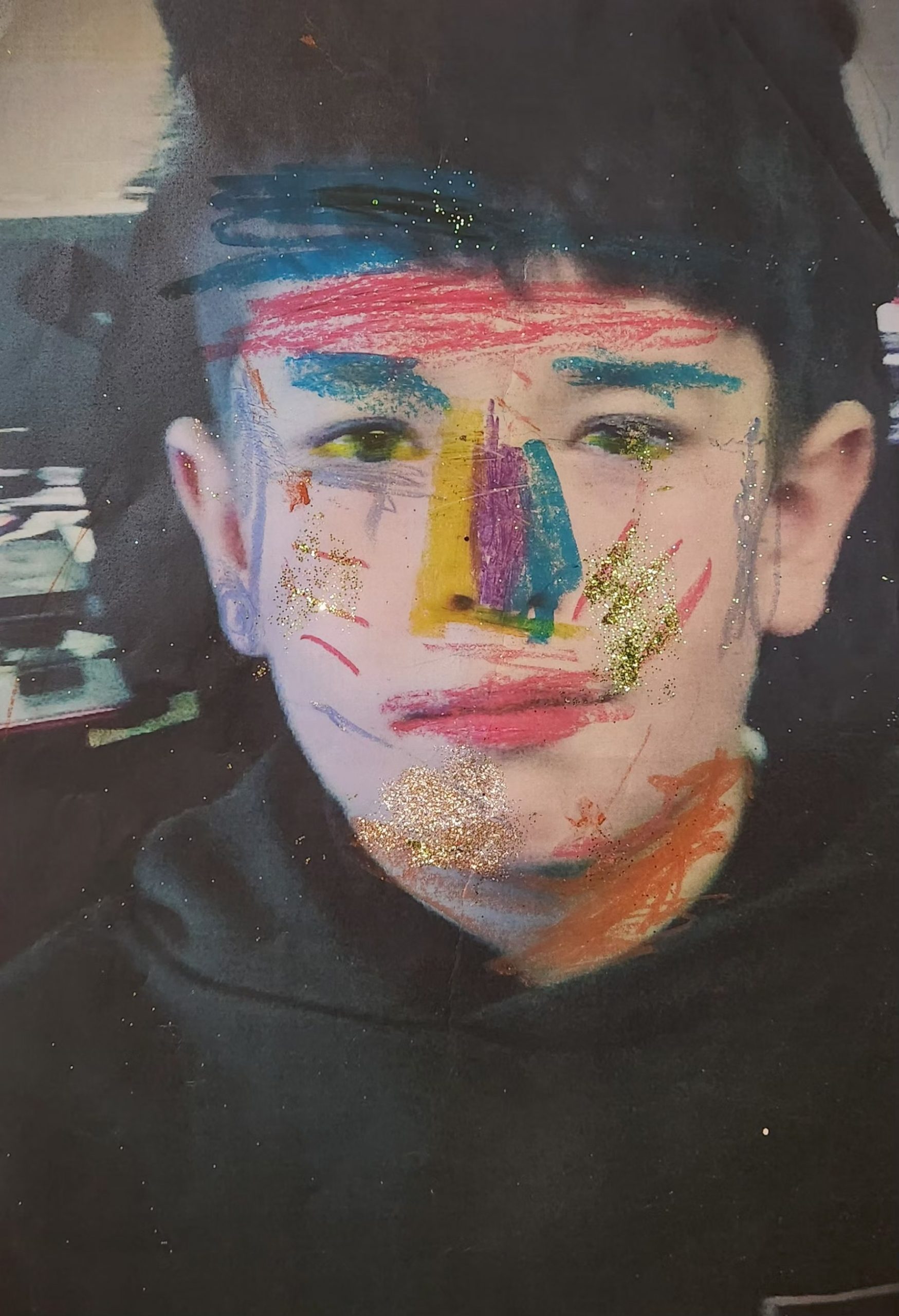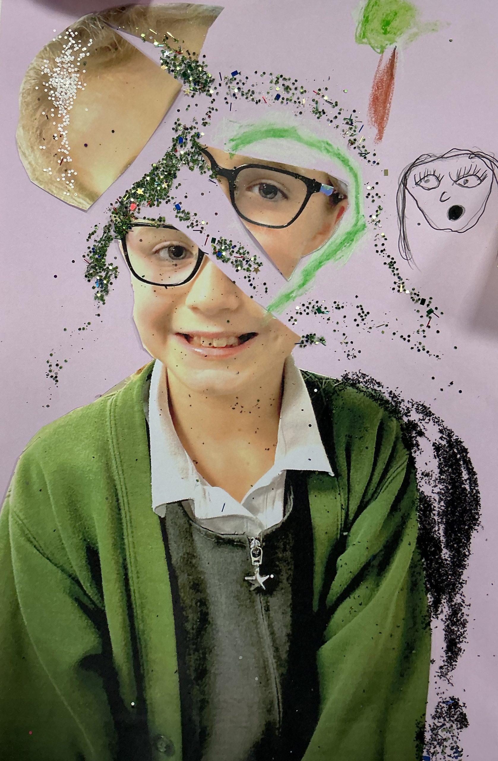 Photo, oil pastel, pen, glitter, 29cm x 21cm