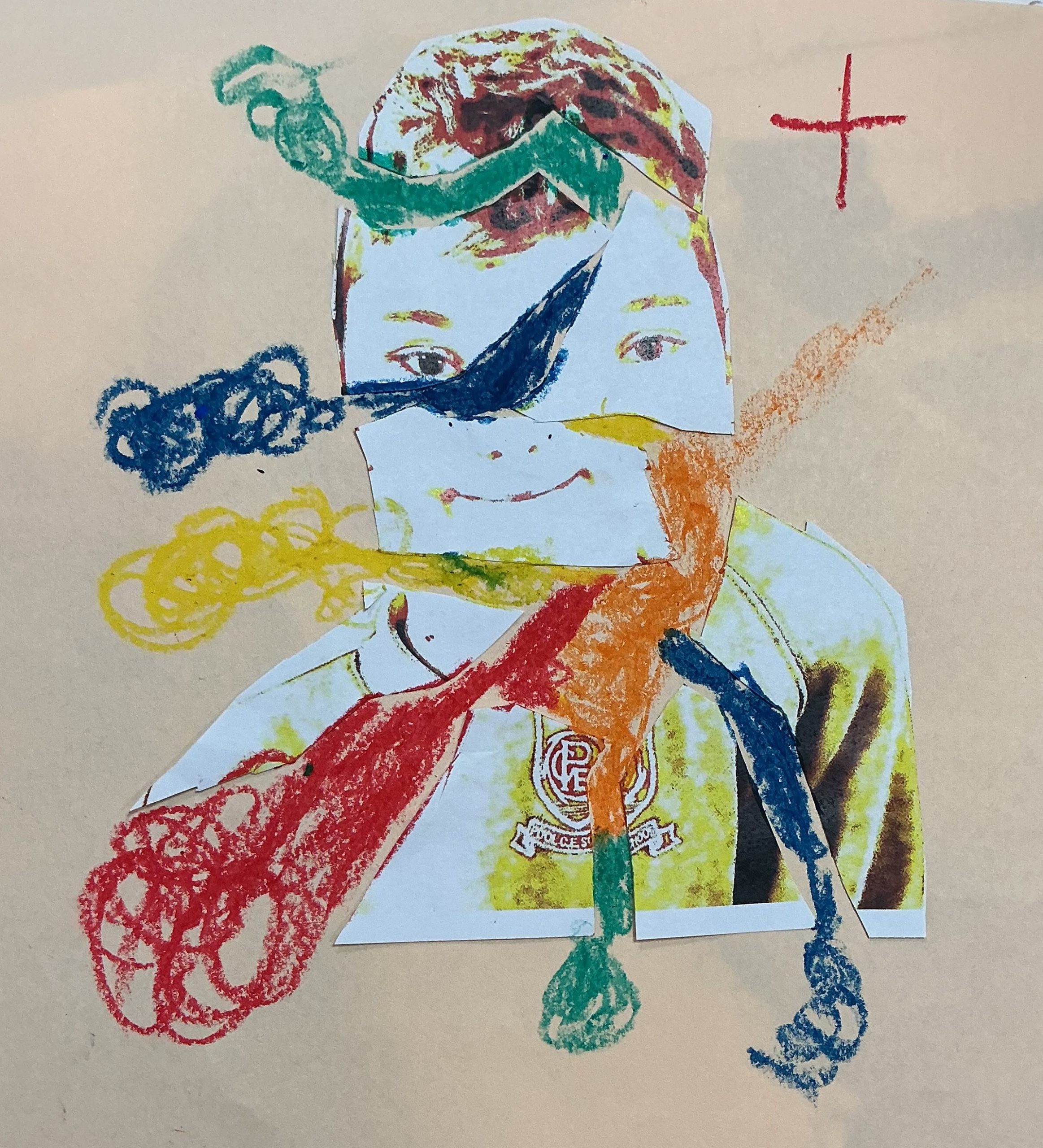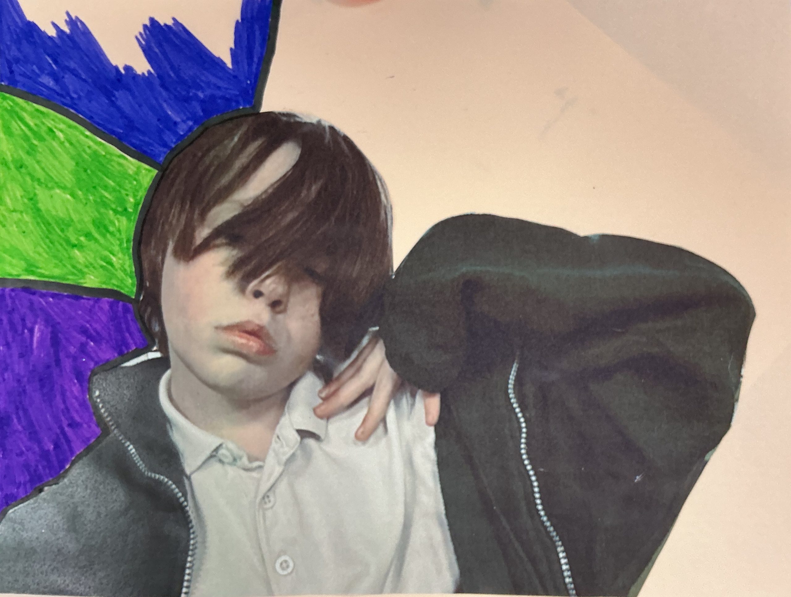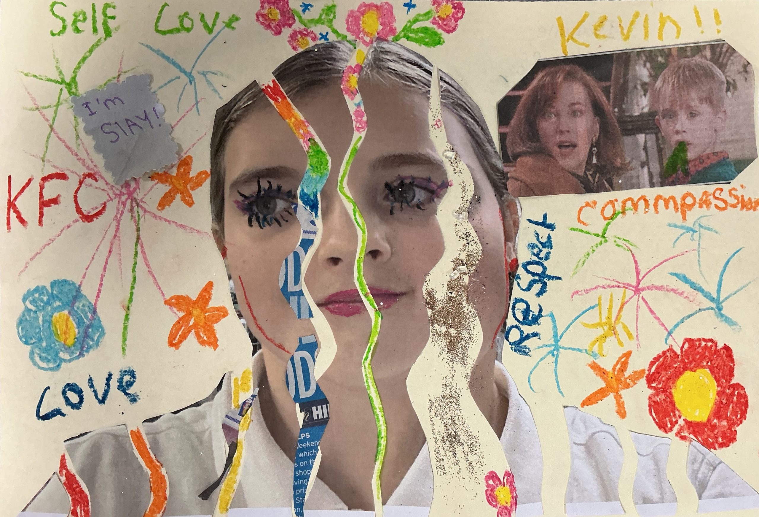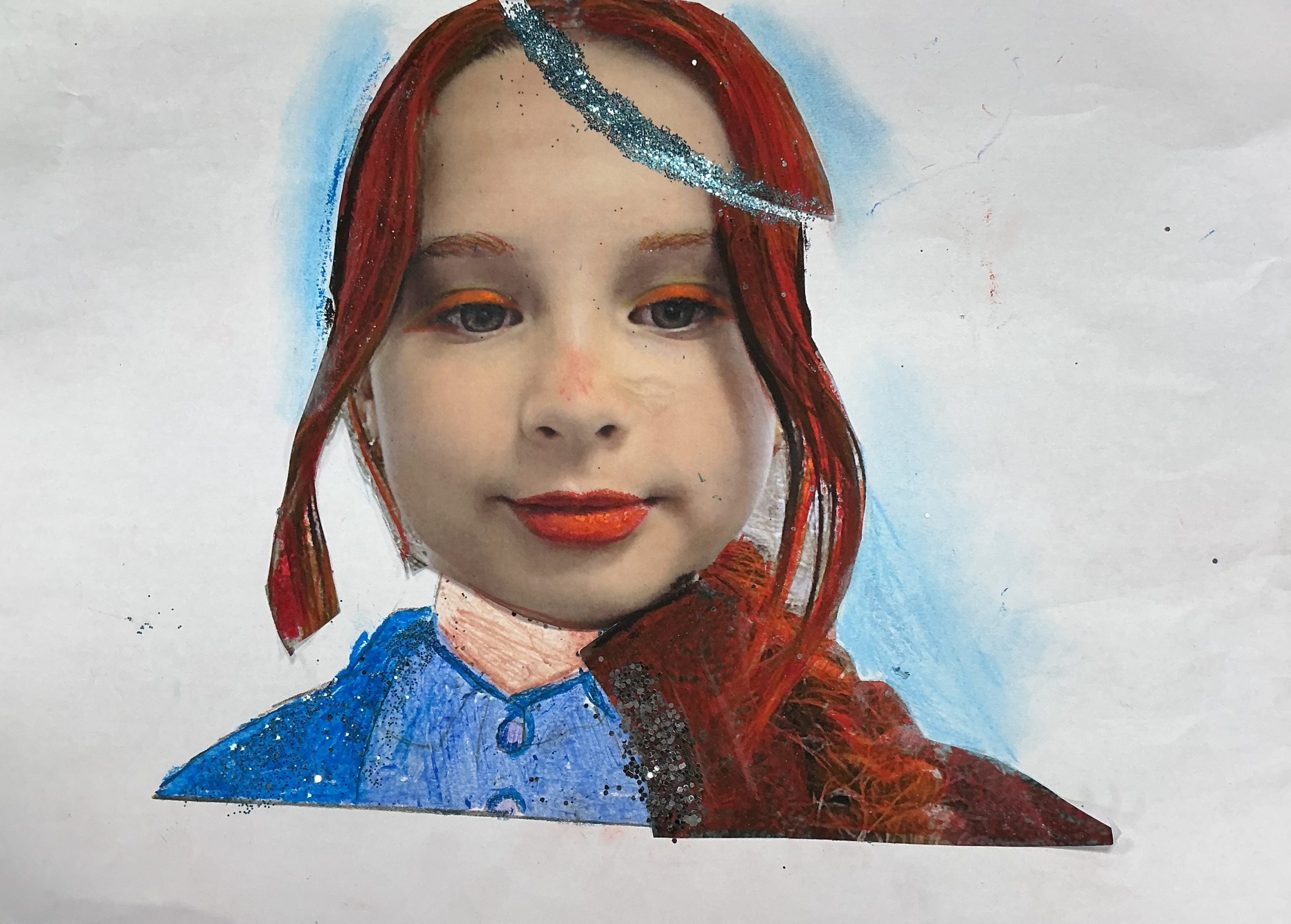 Photo, oil pastel, pen, glitter, 29cm x 21cm