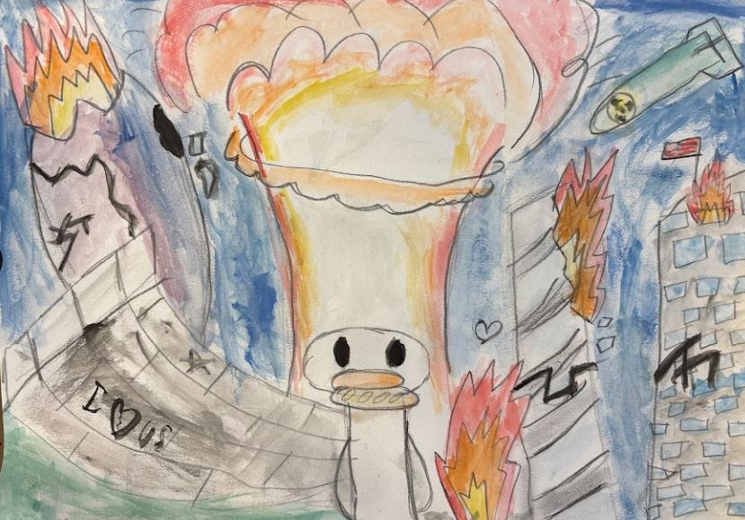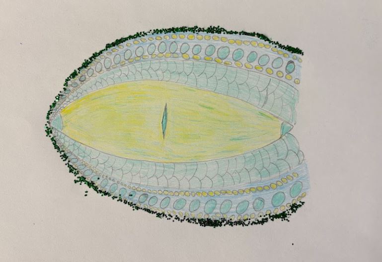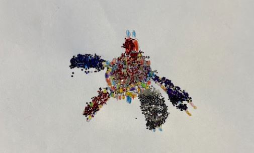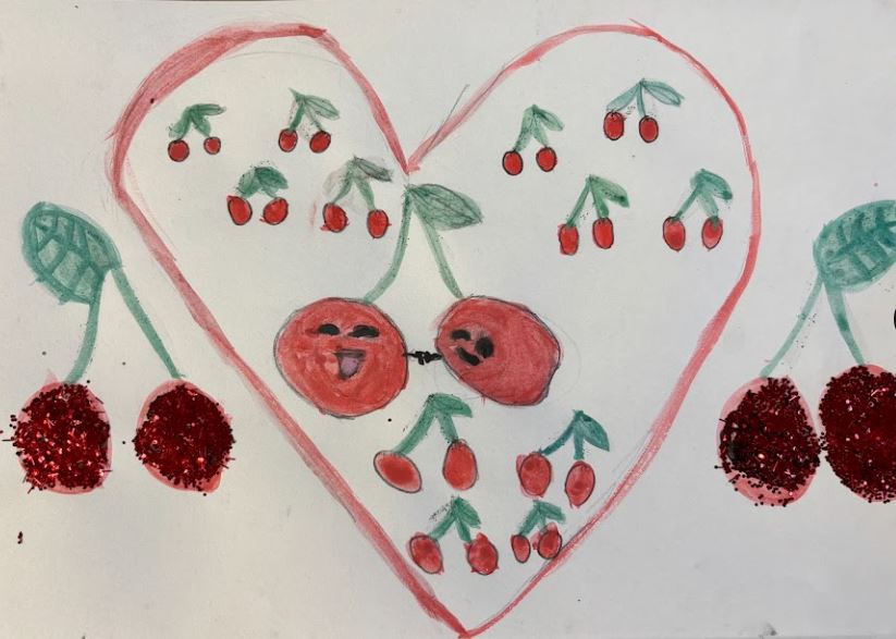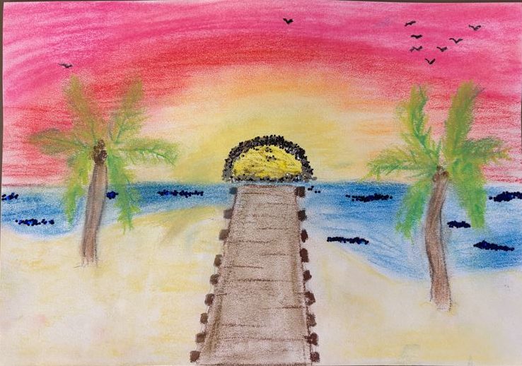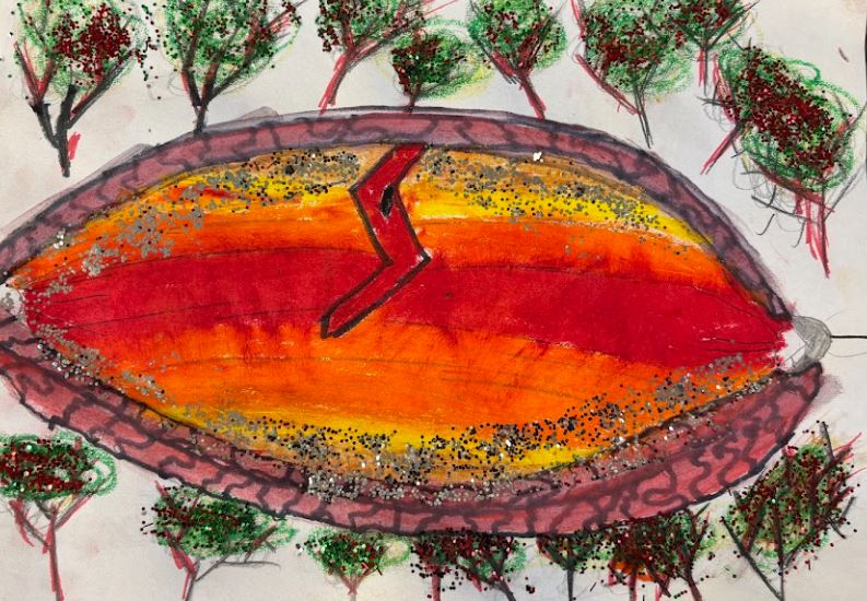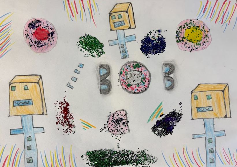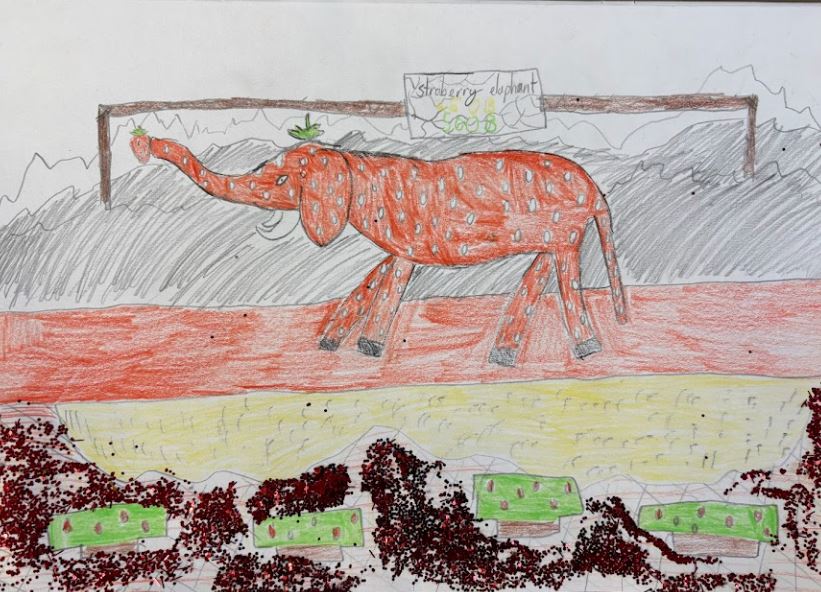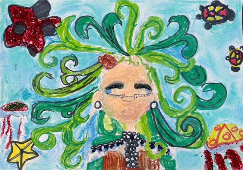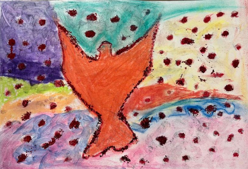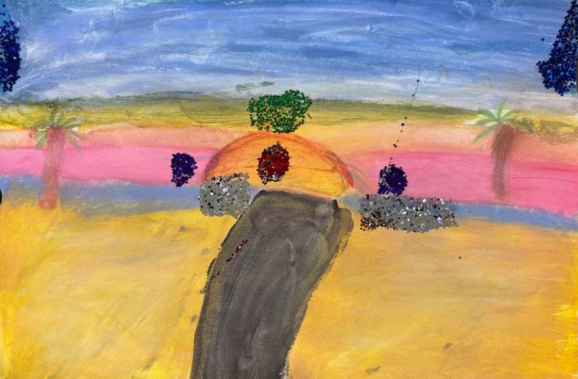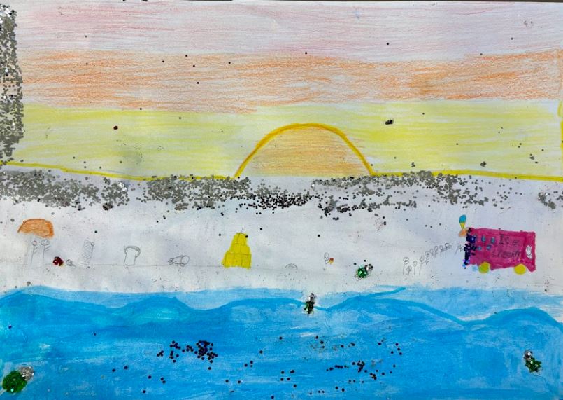 Water colour, oil pastels, glitter paint and glitter, 30cm x 21cm